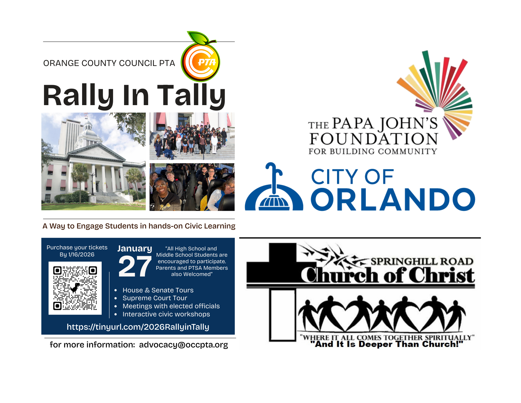 We extend our deepest gratitude to the Papa Johns Foundation for Building Community and the City of Orlando for their generous support of our “Rally in Tally” event. Thanks to their crucial funding, students from Orange County have the unique opportunity to visit our state capitol, engage directly with lawmakers, and witness the legislative process firsthand.