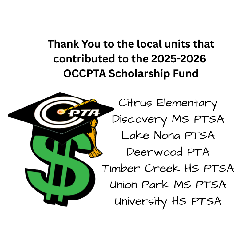 OCCPTA does not receive any funds from Florida PTA or National PTA. Your PTA/PTSA unit’s County Council dues allows programs like these to be offered, therefore only members from PTA/PTSAs in good standing are eligible to be considered for the awarding of scholarships. We Thank all the PTA/PTSAs of Orange County that value assisting students in this way and contribute to the Scholarship Fund.